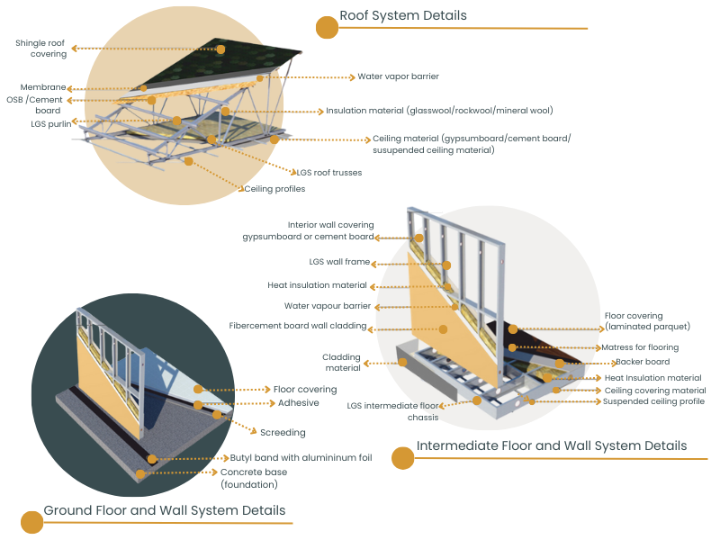 Campacx offers innovative light gauge steel building systems designed to meet the diverse needs of modern construction projects. Our systems allow for superior performance, durability, and efficiency by detailing the building walls, floors, and roof layers according to local regulations and project-specific requirements. Below, image describes standard details of our LGS frame building's wall-floor, wall-intermediate floor chassis, and roof systems.