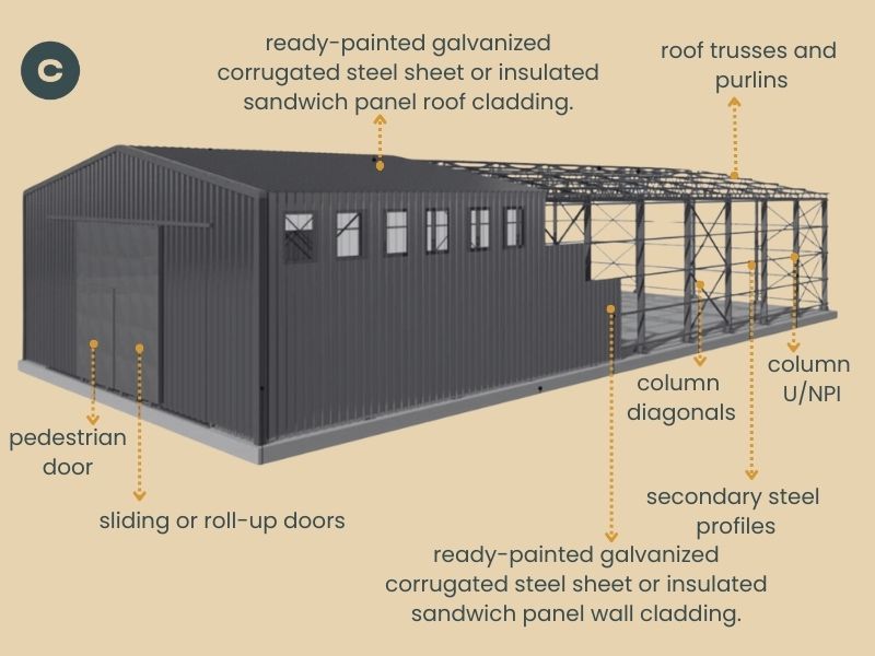 Depending on the intended use, customized features such as sliding or roll-up doors, translucent light bands, or windows are incorporated into the design. Buildings are categorized as insulated when using sandwich panels for walls and roofs, whereas those with trapezoidal sheeting for walls and roofs are considered non-insulated.