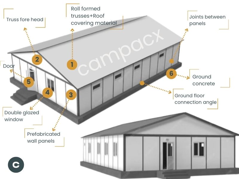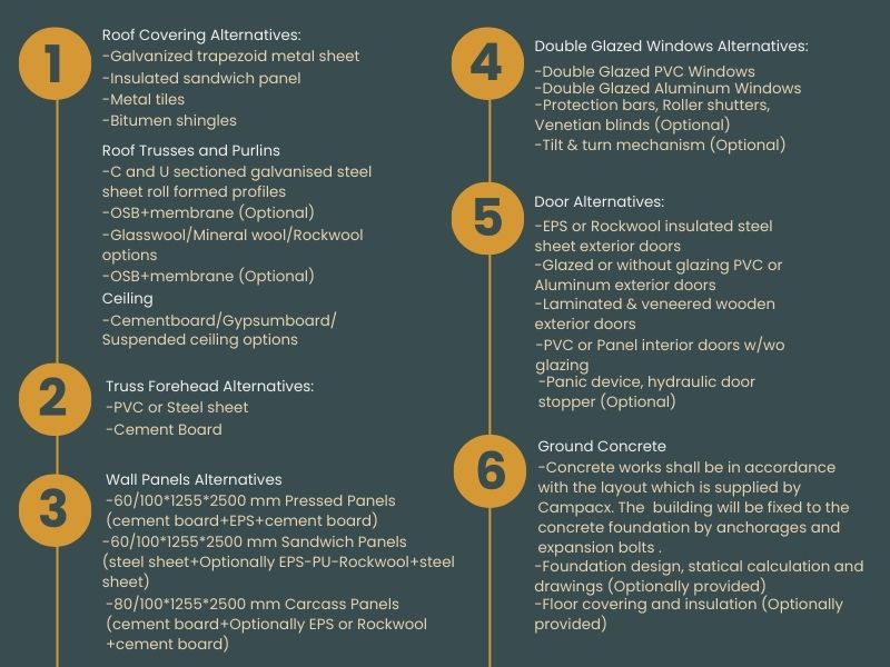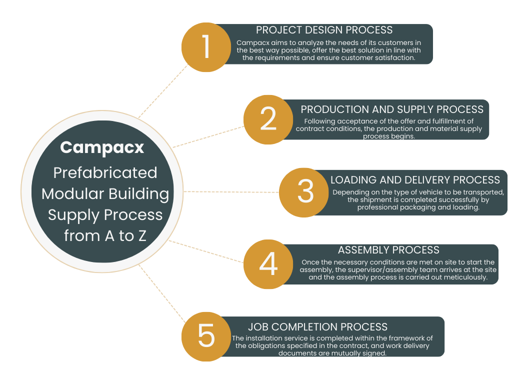 Campacx takes into account project inputs in prefabricated buildings (such as climatic data, building purpose, local regulations, technical specifications and requests), and offers prefabricated building alternatives consisting of load-bearing or non-load-bearing walls, such as prefabricated worker camps, prefabricated hospitals, prefabricated buildings that best suit the customer's needs. It supplies public buildings such as schools, prefabricated offices, prefabricated emergency residential buildings, prefabricated military buildings and prefabricated houses.