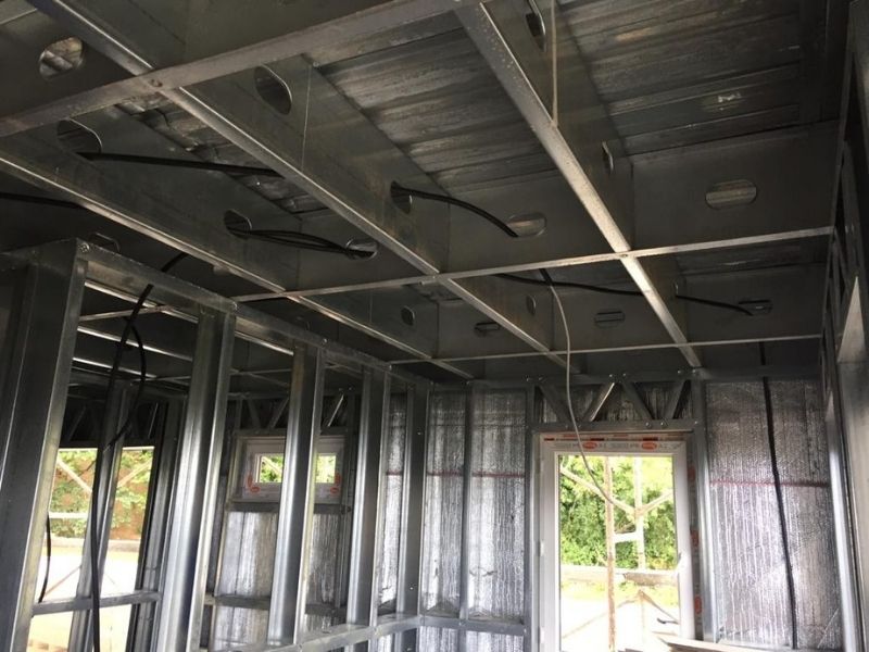 LGS frame system structures are generally assembled with a bolted/screwed connection using weldless construction technology. The assembled profiles are covered with sheets on both sides to form the walls of the structure. Generally, plasterboard is used in single or double layers on interior walls. Wall elements, installation gaps, which are covered on one side, are covered with a cement board on the other side by applying the preferred insulation material after the electrical and plumbing piping process is completed through the holes opened in the factory production environment.
